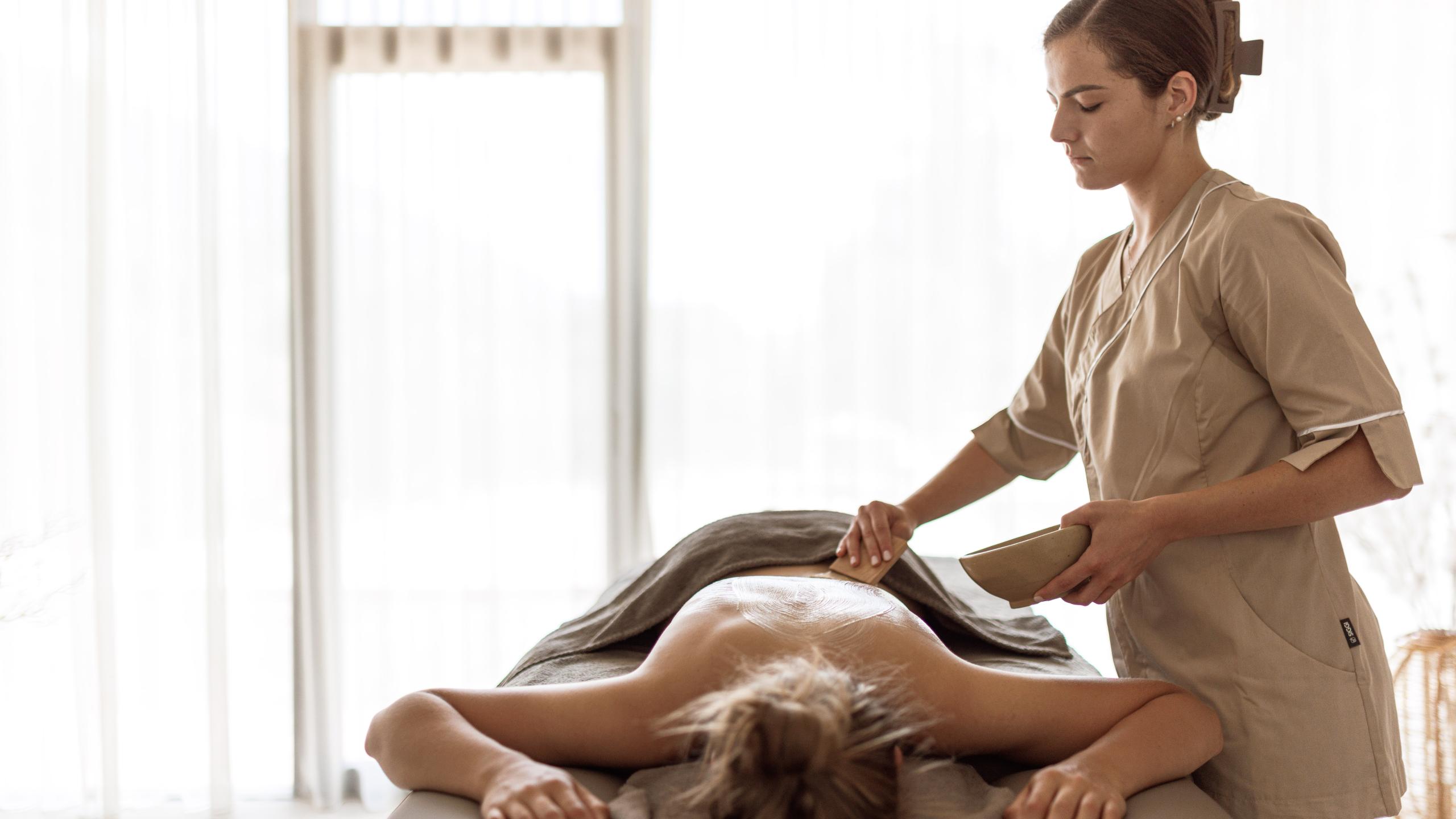 Eine peelende Ganzkörpermassage mit Kräuterpulver, das mit warmem Öl gemischt wird.