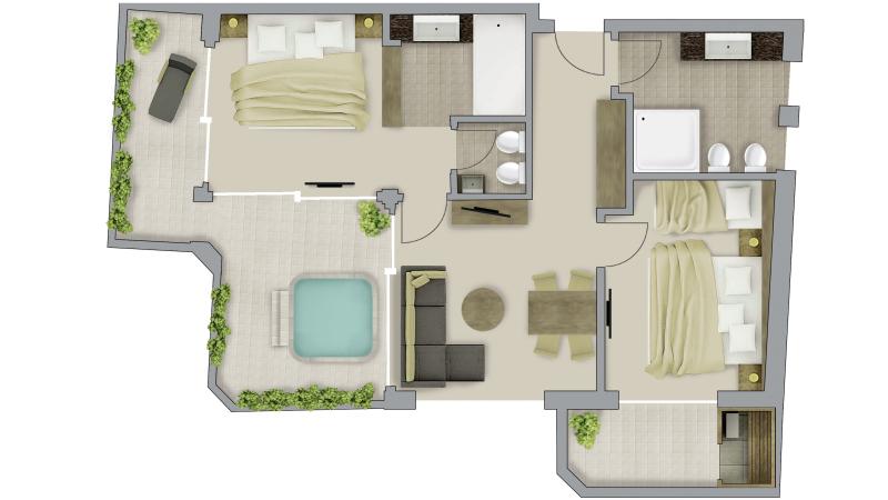 Bitte beachten Sie, dass der Zimmergrundriss schematisch und nicht maßstabgerecht dargestellt ist – es kann zu leichten Abweichungen in Raumaufteilung und Möblierung kommen.