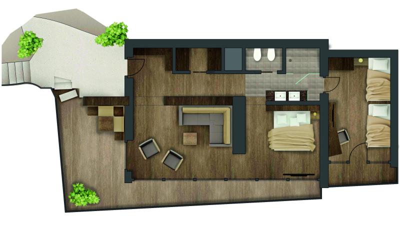 für 2–7 Personen, ca. 220 m² (davon 80 m² private Dachterrasse mit Hot-Whirlpool, Außensauna und Kuschelnestern). Das Luxus-Chalet liegt auf 2 Etagen mit 2 separaten Eingängen und ist nicht intern verbunden. Es bietet 3 moderne Schlafzimmer mit komfortablen Betten mit wunderbarem Blick in die Natur. Die obere Etage mit ca. 95 m² bietet einen großem Wohnschlafraum, abgetrennter Sitzecke und Kamin, begehbarem Kleiderschrank, ein großzügiges Badezimmer mit Doppelwaschbecken, Erlebnis-Dusche, Bidet und WC separat. Auf der selben Ebene befindet sich ein Kinderzimmer mit einem Stockbett und einem Einzelbett. Das dritte Schlafzimmer - in der unteren Etage - ist ca. 45 m² groß und verfügt ebenfalls über begehbaren Kleiderschrank, Wohnecke, ein großzügiges Badezimmer mit Doppelwaschbecken, Erlebnis-Dusche, Bidet und WC separat. Wasserkocher mit kleinem Tee und Kaffeesortiment sowie Nespresso-Maschine im Zimmer, ebenso individuell regulierbare Klimaanlage und Holzboden. Direkter Zugang zum Sky-Pool des Alpenschlössels. Tiefgarage inklusive.